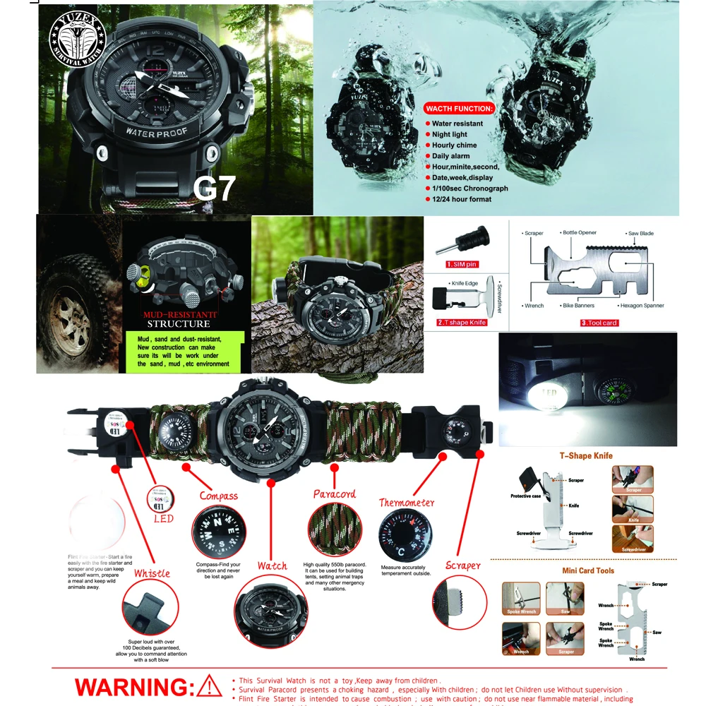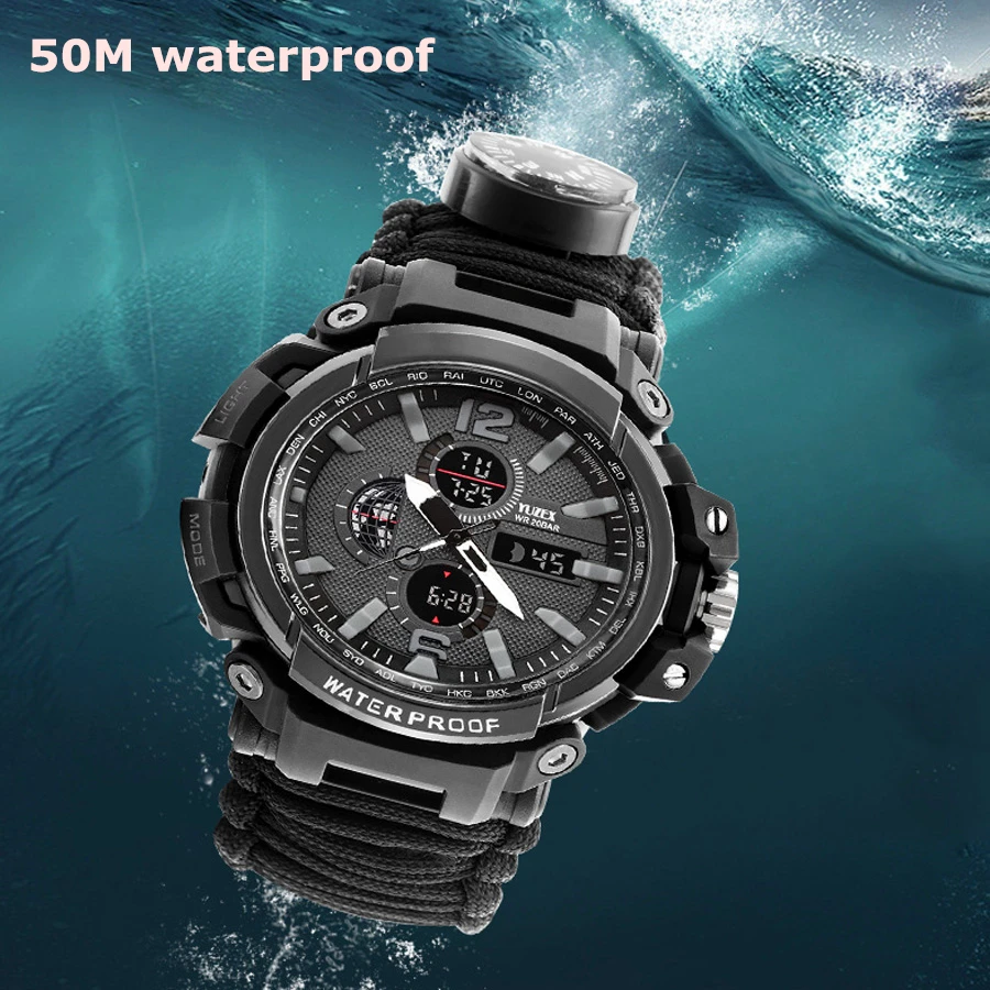 EDC Outdoor Survival Watch Waterproof Emergency Gear Camping Paracord Bracelet Knife Compass Whistl